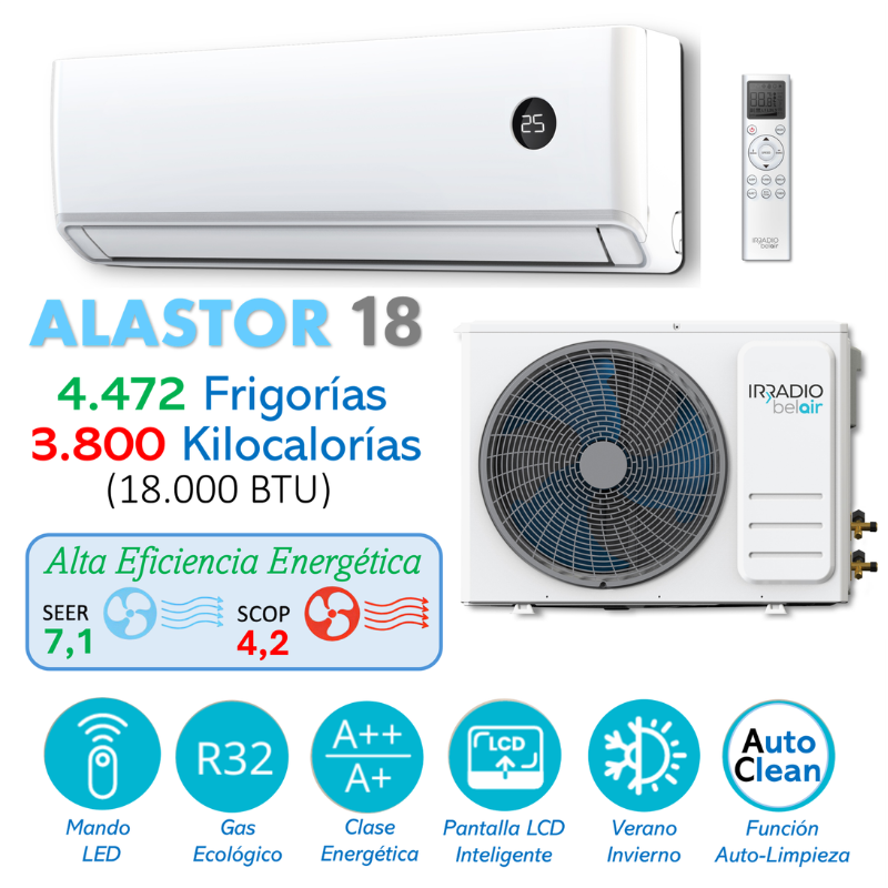 Aire Acondicionado SPLIT INVERTER DC . 4.472 Frigorías/ 3.800 Kilocalorías/h (18.000 BTU). Apta para 60m2 /880 m3/h. Refrigerante ecológico R32. Pantalla digital inteligente. Clasificación Energética A++ frío/Clasificación energética A+ en bomba de calor. Nivel sonoro Unidad interior 42 dB. Indice protección Unidad exterior IPX4. Coeficiente: SEER 6,1/SCOOP 4, CONSUMO AÑO 289 KWh. Filtros desmontables y lavables. Funciones: Ventilación, Deshumidificación, Sleep mode, Turbo. Función AUTO-LIMPIEZA. Mando a distancia con pantalla digital.