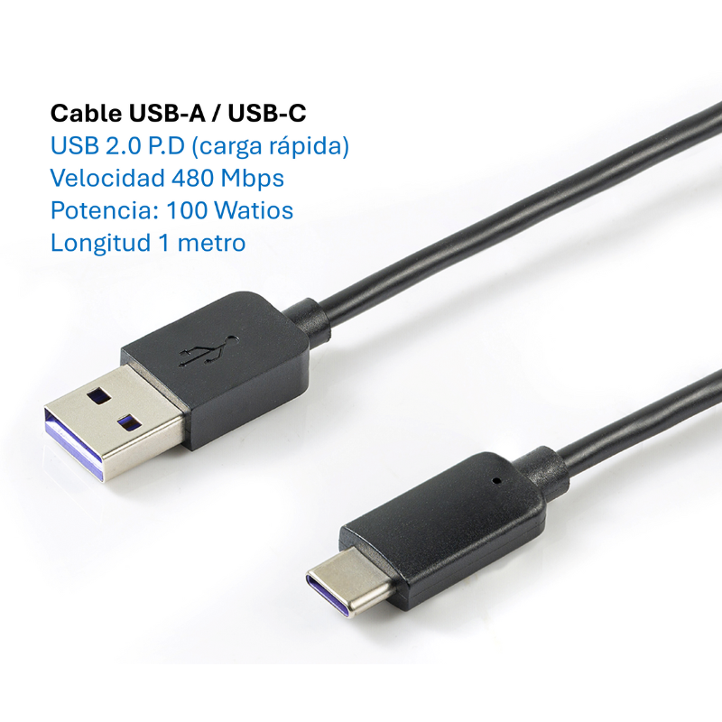 Cable USB 2.0 USB.A/USB-C de alta velocidad, 1 metro. (igual o mejor que un cable original). Funda de PVC. Velocidad 480 Mbps. Potencia 100 watios.