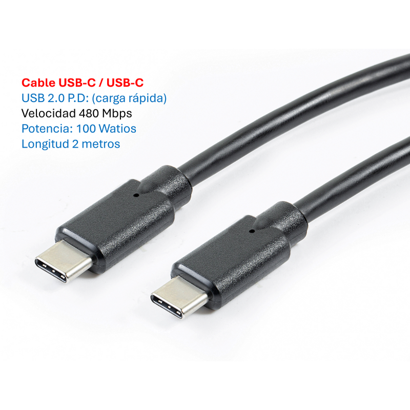 Cable USB 2.0 USB.C/USB-C de alta velocidad 2 metros. (igual o mejor que un cable original). Funda de PVC. Velocidad 480 Mbps. Potencia 100 Watios