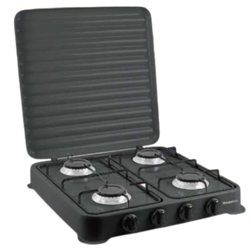 Cocina de Gas 4 Fuegos. Estructura de acero esmaltado en color negro. Parrilla y quemadores extraíbles y desmontables. Uso exterior. Potencia máxima 4 x 2 Kw . Selector de potencia. Medidas: 52,5×8,4×50 cm