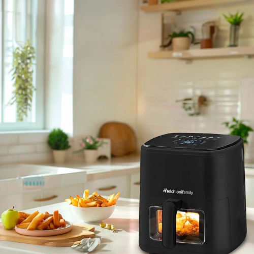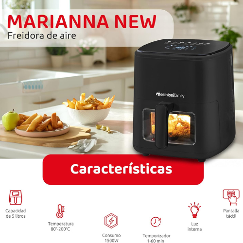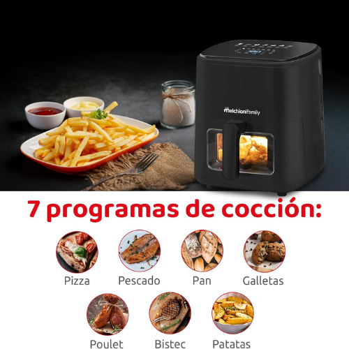 Freidora sin aceite 5 Litros. Teclado en la parte superior DIGITAL y TACTIL (no tienes que agacharte). Cesta/depósito con frontal cristal. Antiadherente. 7 Programas pre-configurados. Luz interior. Potencia 1.400 Watios. Temperatura ajustable de 80ºC/200ºC. Temporizador 60 minutos. Luz interior. DISEÑO MUY COMPACTO (solo 29,3 cm de ancho). Color Negro. Medidas: 30×29,3×32 cm