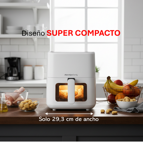 Freidora sin aceite 5 Litros. Teclado en la parte superior DIGITAL y TACTIL (no tienes que agacharte). Cesta/depósito con frontal cristal. Antiadherente. 7 Programas pre-configurados. Luz interior. Potencia 1.400 Watios. Temperatura ajustable de 80ºC/200ºC. Temporizador 60 minutos. Luz interior. DISEÑO MUY COMPACTO (solo 29,3 cm de ancho). Color Negro. Medidas: 30×29,3×32 cm