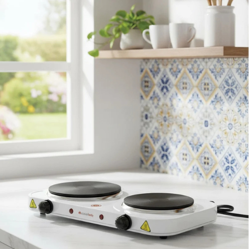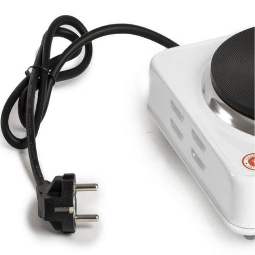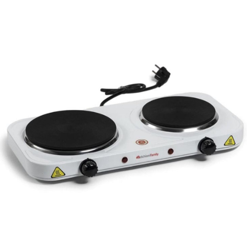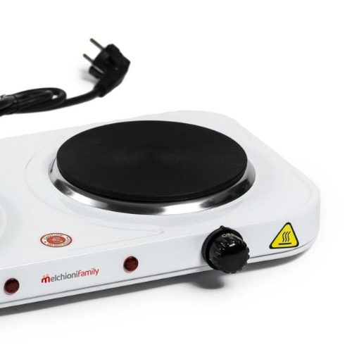 Placa Eléctrica de hierro fundido 2 Fuegos. Selector de potencia mediante termostato. Aro cromado. Diámetro de los fuegos 18,5 cm y 15,5 cm. Potencia 1.500/1.000 Watios. Indicador luminoso On. Medidas 47,5x26x6,5 cm