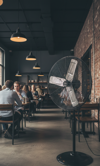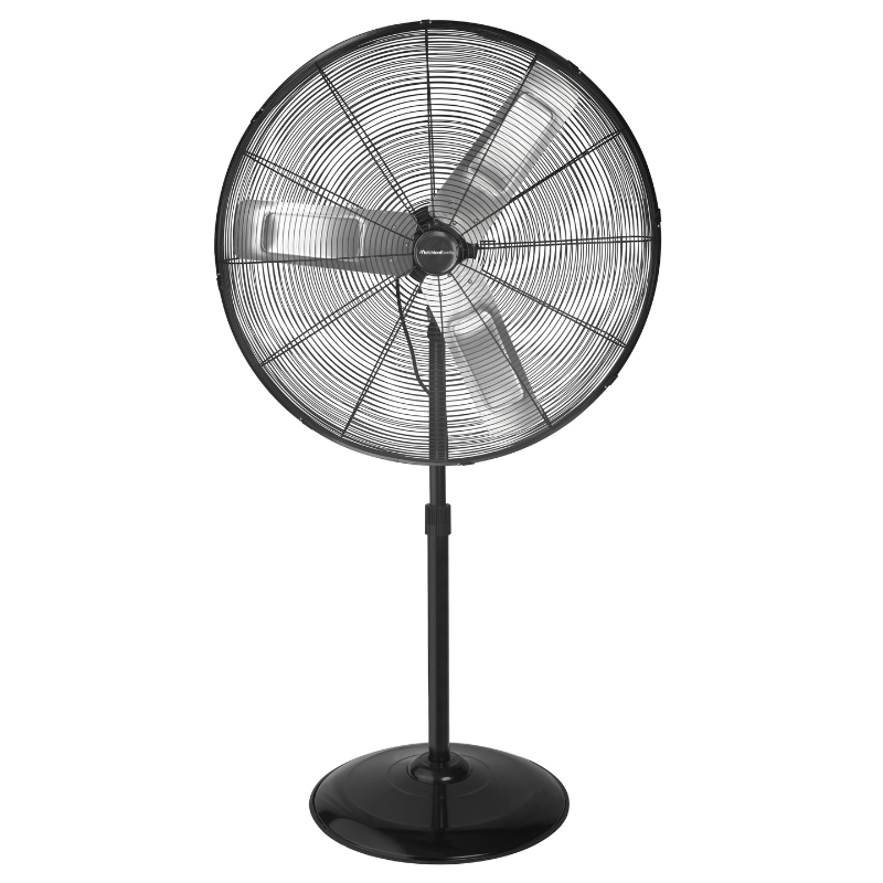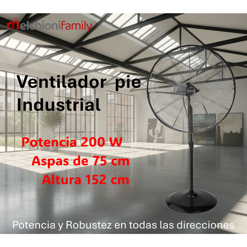 Ventilador Industrial de Pie. Palas de aluminio de gran formato. Diámetro de las aspas 75 cm. Potencia 200 Watios. Oscilación lateral de 85º a ambos lados. Acabado en Hierro (peso 17,5 Kg), Altura ajustable hasta 152cm. Selector de potencia de 3 velocidades. Medidas: 152 x 80 x 18 cm